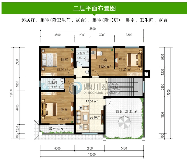 二 层:起居厅、卧室(附卫生间、露台)、卧室(附书房)、卧室、卫生间、露台