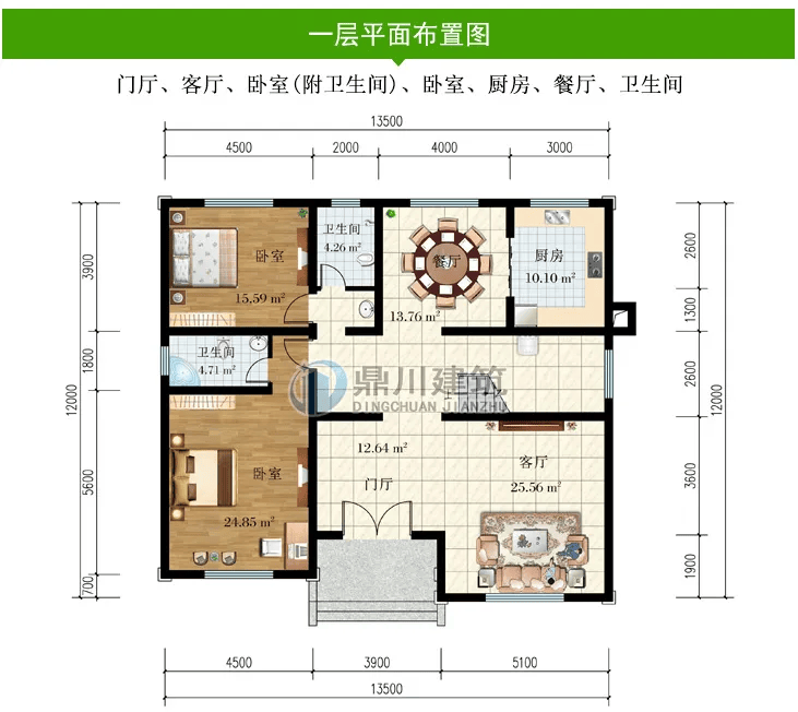 别墅图纸编号:DC0646,砖混结构,开间13.5米,进深12米,占地面积165.36平方米,建筑面积337.64平方米,主体造价35-45万。